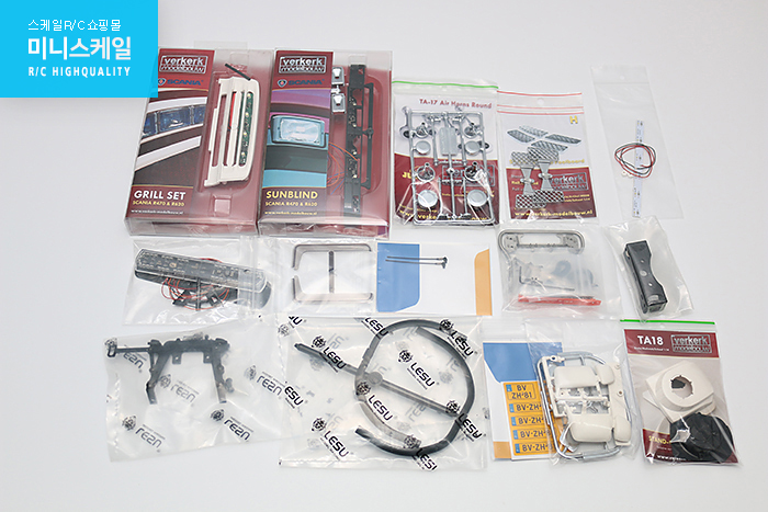 - 베르켈크 Scania Top-line High Roof, Scania Mirror set, Scania Sunblind, Scania Grill, Waeco Stand Aircon, Vantage Lightbar Orange, Truck Driver figure, Co-Driver figure, Antenna Detailup Set, Scania Wind deflector, Scania Footboard, Jumbo Air Horn Set Round, KTS-NL