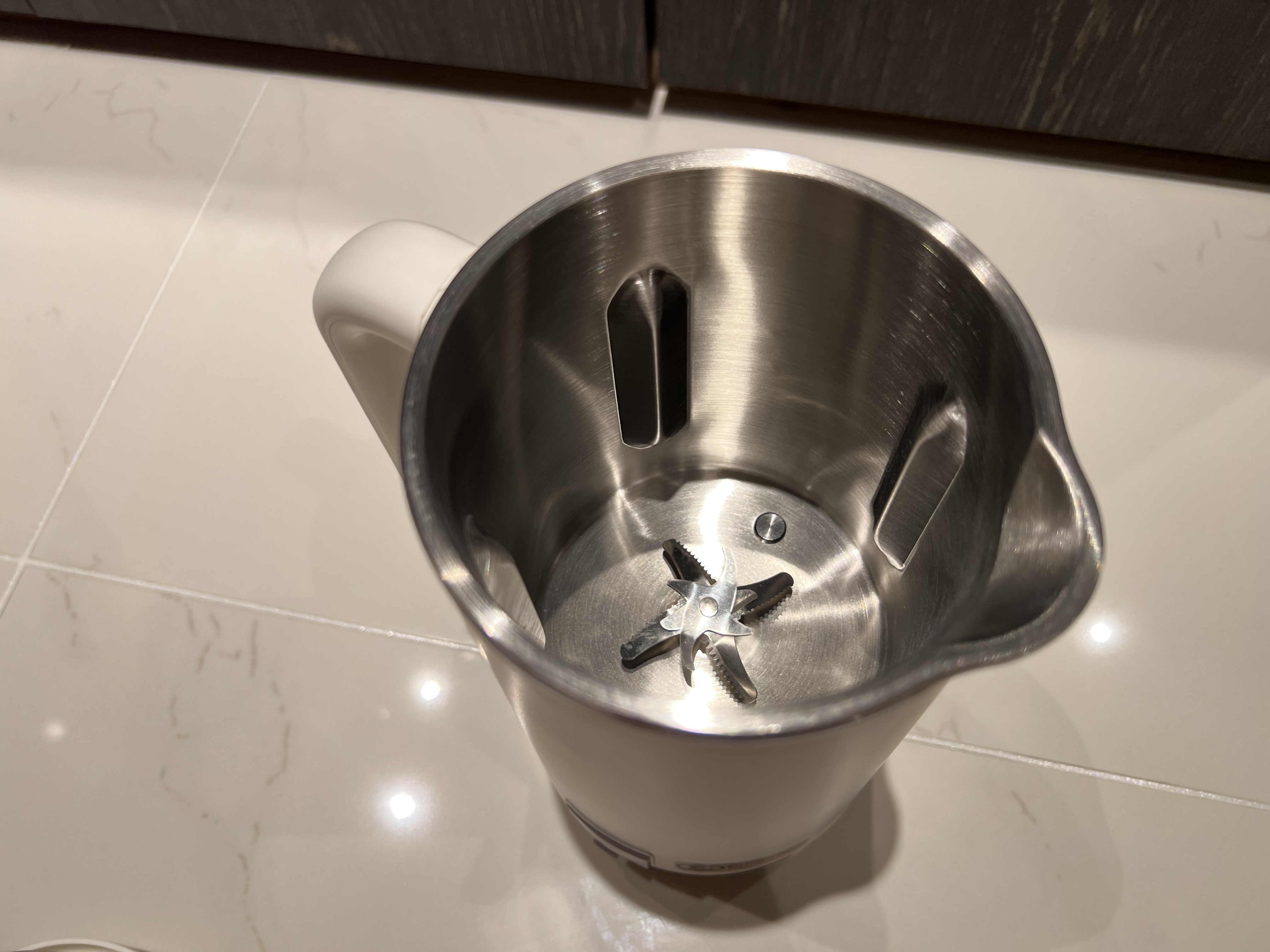 내부엔 안전한 304 스텐을 사용, 800ml의 대용량통, 작은알갱이 및 늘러붙지 않도록 하단센터에 칼날이 설치되어있다.