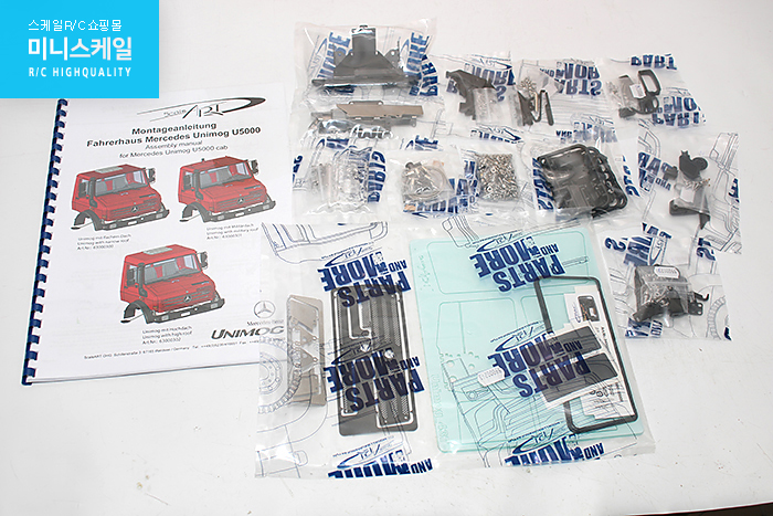 [Mercedes Unimog with three-way tipper] 이 키트는 Mercedes Unimog with three-way tipper의 제작에 적합하며 다음과 같은 구성 요소가 포함되어 있습니다.